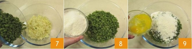 Fügen Sie hier auch die gekochten grünen Bohnen hinzu 7, geben Sie den geriebenen Käse 8 und die Eier 9 dazu.