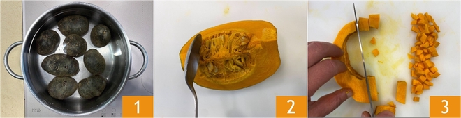 Um die lila Kartoffelgnocchi mit Kürbiscreme und Schwarzkohl zuzubereiten, die lila Kartoffeln zuerst in kaltem Wasser kochen, das dauert je nach Größe etwa 40-50 Minuten 1. In der Zwischenzeit den Kürbis putzen 2 und das Fruchtfleisch in Würfel schneiden 3.