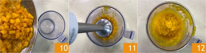 Den Kürbis in einen Behälter geben 10 und mit einem Stabmixer pürieren 11, um ihn in eine Creme zu verwandeln 12.