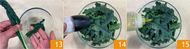 Die Kürbiscreme warm halten und sich dem Schwarzkohl zuwenden: die Blätter von den Stielen trennen 13 und in eine Schüssel geben, dann mit Salz 14 und Öl 15 würzen.