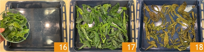 Die Schwarzkohlblätter auf ein Backblech legen 16 und im vorgeheizten Umluftofen bei 200° etwa 15 Minuten backen 17. Nach dieser Zeit sollten die Blätter trocken und knusprig sein 18.