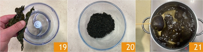 Leicht abkühlen lassen, dann den Schwarzkohl in einen Mixer geben 19 und zu Pulver verarbeiten 20. Das Schwarzkohlpulver beiseite stellen und die Kartoffeln abgießen, die inzwischen gar sein sollten, indem man die Konsistenz mit einem Zahnstocher überprüft 21.