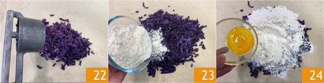 Die Kartoffeln auf die Arbeitsfläche drücken (die Schale bleibt im Kartoffelpresse zurück) 22, dann das Mehl 23, das Ei 24 und eine Prise Salz hinzufügen.