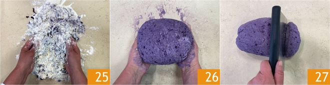 Mit den Händen arbeiten 25, bis ein kompakter und homogener Teig entsteht 26. Den Teig mit einem Teigschaber in kleinere Portionen teilen 27.