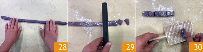 Jede Portion Teig mit den Fingerspitzen zu etwa 2 cm dicken Rollen ausrollen 28. Dabei gelegentlich die Arbeitsfläche mit Grieß bestäuben und den nicht verwendeten Teig mit einem Tuch abdecken, um ein Austrocknen zu verhindern. Die Rollen in kleine Stücke schneiden 29 und sie auf einem mit Grieß bestäubten Gnocchibrett rollen, dabei leicht drücken 30.