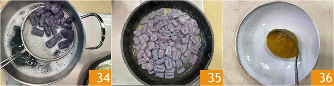 Sobald die Gnocchi an die Oberfläche steigen, abgießen 34 und in die Pfanne mit der geschmolzenen Butter geben 35, dann kurz schwenken, um sie zu mischen. Sie sind bereit zum Anrichten: verteilen Sie die Kürbiscreme auf den Tellern 36.
