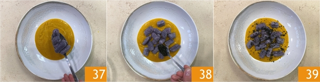 Die Gnocchi hinzufügen 37 und mit dem Schwarzkohlpulver garnieren 38. Servieren Sie Ihre lila Kartoffelgnocchi mit Kürbiscreme und Schwarzkohl sofort 39!