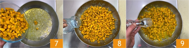 Die Schalotte 6-7 Minuten bei schwacher Hitze dünsten, dann den Kürbis hinzufügen 7 und etwa 15-20 Minuten bei mittlerer bis niedriger Hitze kochen, dabei nach Bedarf heißes Wasser hinzufügen 8. Mit Salz 9 und Pfeffer abschmecken.
