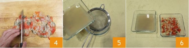 Hacke Sie die Muscheln grob mit einem Messer 4, filtern Sie das gesammelte Wasser der Scheidenmuscheln mit einem Sieb 5 und legen Sie die Scheidenmuscheln und das gefilterte Wasser separat in zwei Schüsseln.