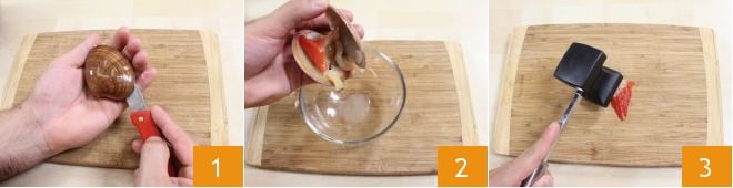 Um die Linguine mit Scheidenmuscheln zuzubereiten, beginnen Sie damit, die rohen Muscheln zu öffnen 1, indem Sie sie am kürzeren Ende der Schale greifen und die beiden seitlichen Muskeln einschneiden. Sammeln Sie ihr Wasser während des Öffnens, lösen Sie die Scheidenmuscheln von den Schalen 2, spülen Sie sie bei Bedarf ab, um Sandreste zu entfernen, und klopfen Sie sie mit einem Fleischklopfer 3.