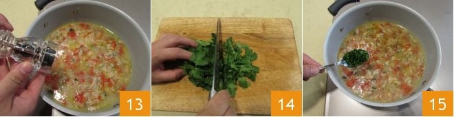 Würzen Sie nochmals mit etwas Pfeffer und denken Sie daran, dass die Scheidenmuscheln nur ein paar Minuten gekocht werden müssen, damit das Fleisch zart bleibt 13. Waschen, dann hacken Sie die Petersilie 14 und fügen Sie sie zur Soße hinzu 15.