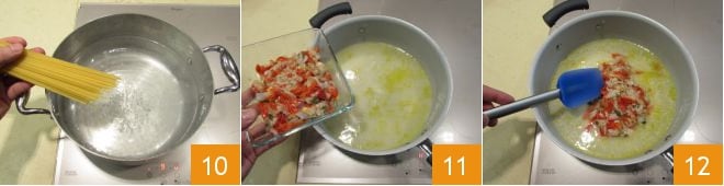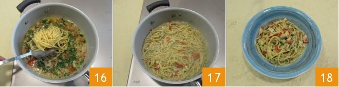 In einem großen Topf die Bavette in reichlich gesalzenem Wasser kochen 10; wenn die Pasta halb durchgekocht ist, geben Sie die Scheidenmuscheln zur Soßenbasis, die Sie vorbereiteten 11, und mischen Sie alles 12.