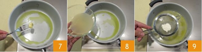 Beginnen Sie mit der Zubereitung der Soße: In einer Pfanne den geschälten ganzen Knoblauch mit einigen Esslöffeln nativem Olivenöl extra für einige Minuten anbraten 7, dann den Knoblauch entfernen und das Wasser der Scheidenmuscheln hinzufügen 8, das gesiebte Mehl, das die Soße cremiger machen soll 9, und nach Geschmack Pfeffer hinzufügen.