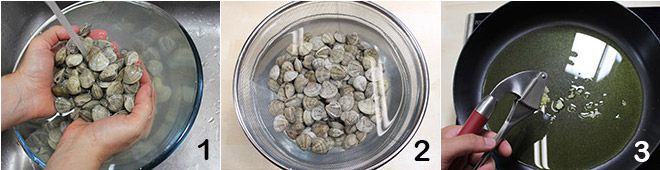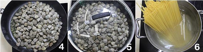 Wenn der Knoblauch fertig ist, die Venusmuscheln hinzufügen 4 und mit einem Deckel abdecken, um sie zu öffnen (es dauert nur wenige Minuten) 5. In der Zwischenzeit einen Topf mit Salzwasser zum Kochen bringen und die Bavette darin kochen, dann al dente abtropfen 6.