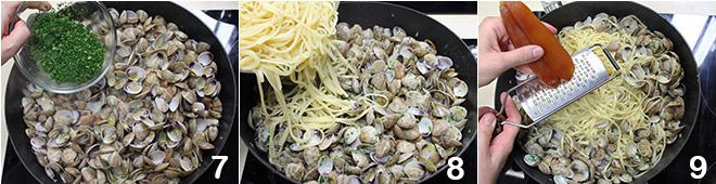 Wenn sich die Venusmuscheln geöffnet haben, fügen Sie die gehackte Petersilie 7 und die al dente abgegossene Pasta 8 hinzu, dann reiben Sie die Bottarga vom Meeräsche direkt über die Pasta 9. Gut umrühren, um alle Zutaten zu vermischen, den Herd ausschalten und Ihre Linguine mit Bottarga und Herzmuscheln sind fertig zum Servieren.