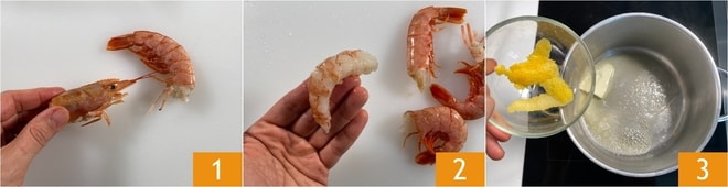 Um die Linguine mit Garnelen, Kirschtomaten und Zitrone zuzubereiten, beginnen Sie zunächst mit der Wie man Garnelen reinigt. Trennen Sie den Kopf ab 1, bewahren Sie ihn jedoch auf, da er für die Bisque verwendet wird. Entfernen Sie den Panzer und den Darm, und gewinnen Sie das Fleisch 2. Dann beiseite stellen. Für die Bisque schmelzen Sie die Butter in einem Topf und fügen die Zitronenschale hinzu 3.