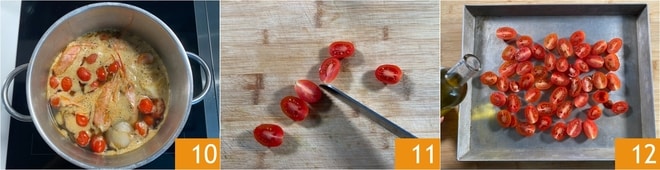 Wenn sie fertig ist 10, filtern Sie sie und halten sie warm. In der Zwischenzeit die confierten Kirschtomaten zubereiten. Schneiden Sie die Kirschtomaten in zwei Hälften 11, legen Sie sie mit der Schnittfläche nach oben in eine Backform. Mit Öl beträufeln 12.