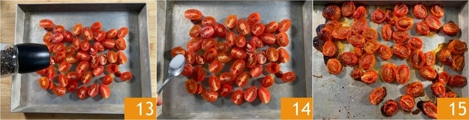 Fahren Sie mit Salz und Pfeffer fort 13. Fügen Sie auch den Zucker hinzu 14 und backen Sie sie im Umluftofen bei 250°C für 10 Minuten 15. Die gerösteten Kirschtomaten beiseite stellen.