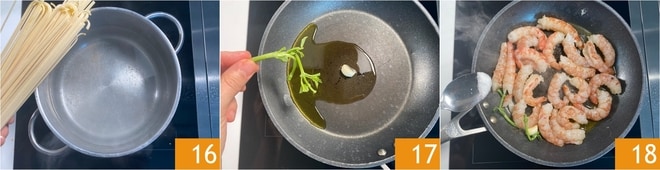 Die Pasta in kochendem Salzwasser kochen 16. In der Zwischenzeit etwas Öl in einer Pfanne erhitzen, Knoblauch und Basilikumstängel hinzufügen 17. Die Garnelen hinzufügen 18.