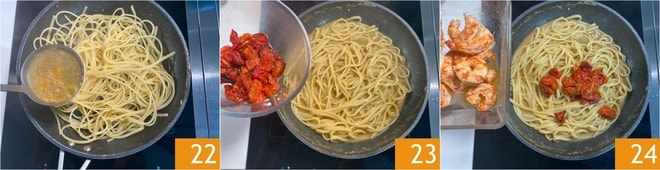 Weiterkochen, indem Sie die Bisque nach und nach 22 hinzufügen, bis die Pasta al dente ist. Die confierten Kirschtomaten 23 und die Garnelen 24 hinzufügen.