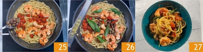Fügen Sie die Taggiasca-Oliven 25, einige Basilikumblätter und eine Prise Zitronenschale hinzu 26. Ihre Linguine mit Garnelen, Kirschtomaten und Zitrone sind bereit zum Genießen 27!