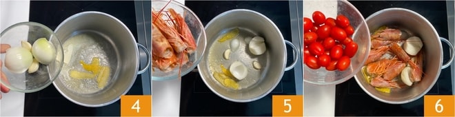 Fügen Sie den Knoblauch, die halbierte Zwiebel 4, die Garnelenköpfe 5 und die Kirschtomaten 6 hinzu.