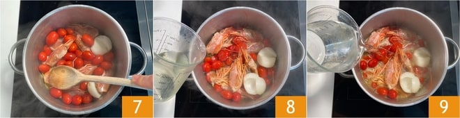Drücken Sie die Köpfe 7, während die Hitze hoch bleibt. Mit Weißwein ablöschen 8 und den Alkohol verdampfen lassen. Mit Wasser bedecken 9 und 30 Minuten bei mittlerer Hitze kochen.