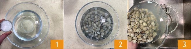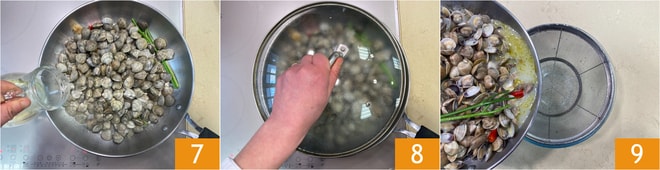Nach etwa einer Minute mit Weißwein ablöschen 7, erneut mit dem Deckel abdecken 8 und etwa 2-3 Minuten kochen lassen, damit sie sich öffnen. Schalten Sie dann die Hitze aus und gießen Sie die Lupinen durch ein Sieb ab, wobei Sie die Kochflüssigkeit in einer Schüssel auffangen 9; sie wird später bei der Zubereitung benötigt.