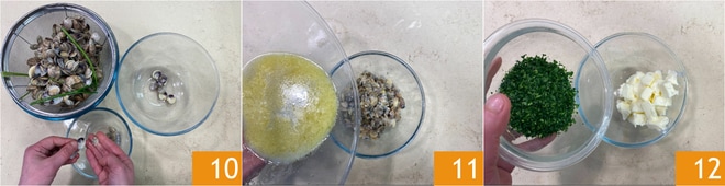 Jetzt die Früchte in einer Schüssel sammeln und die leeren Schalen entfernen 10; es ist sehr wichtig, auch die nach dem Kochen geschlossenen Lupinen zu entfernen, da sie voller Sand sind. Bedecken Sie die Früchte mit einem kleinen Teil der Kochflüssigkeit, damit sie nicht austrocknen 11. Stellen Sie die Lupinen in den Kühlschrank und kümmern Sie sich um die Petersilienbutter: Hacken Sie fein nur die Blätter der Petersilie und fügen Sie sie der in Würfel geschnittenen Butter hinzu, die Sie etwa 30 Minuten bei Raumtemperatur gelassen haben 12.