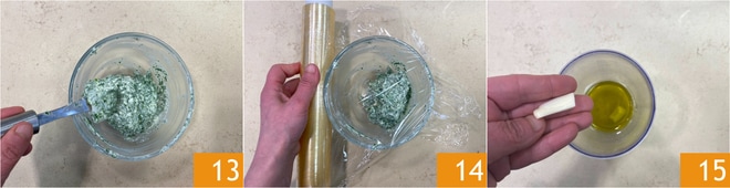 Gut mit einem Spatel verrühren, um die Mischung zu kombinieren 13, dann mit Folie abdecken und in den Kühlschrank stellen 14. Fahren Sie mit dem Knoblauchöl fort: Gießen Sie in einen schmalen und hohen Behälter das Olivenöl und die Knoblauchzehe, die Sie geschält und vom inneren Keim befreit haben 15.