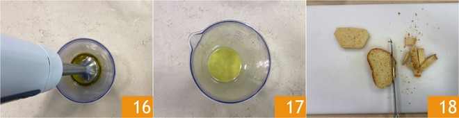 Mit dem Stabmixer pürieren 16, um eine homogene Sauce zu erhalten 17, und beiseite stellen. Nehmen Sie nun das altbackene Brot und entfernen Sie die Kruste 18.