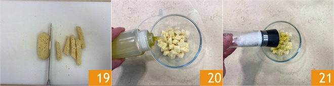 Die Krume in Würfel schneiden 19, in eine Schüssel geben und mit einem Schuss Öl 20 und Salz 21 würzen.