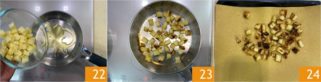 Das Brot in einer Pfanne mit einem Schuss Olivenöl rösten 22. Wenn sie goldbraun und knusprig sind 23, die Brotwürfel auf ein mit Küchenpapier ausgelegtes Tablett legen, um das überschüssige Öl aufzusaugen 24.