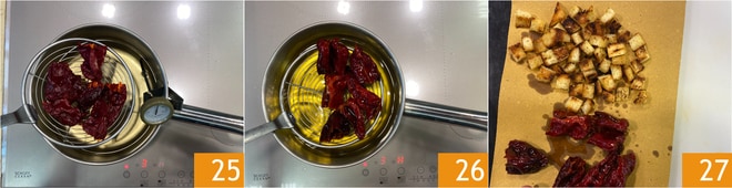 Jetzt zur Zubereitung der knusprigen Paprikaschoten übergehen: Erhitzen Sie das Pflanzenöl in einem kleinen Topf auf 150°, dann die knusprigen Paprikaschoten mit einem Schaumlöffel eintauchen 25, das Kochen muss sehr schnell sein, sonst saugen sie sich mit Öl voll und werden bitter. Abtropfen lassen, sobald sie aufgehen 26, und auf das gleiche Tablett mit Küchenpapier legen, auf dem Sie auch die Brotwürfel gelegt haben 27.