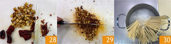 Einmal abgekühlt, die knusprigen Paprikaschoten und das Brot zusammen hacken 28, um Krümel zu erhalten 29. Beiseite stellen und die Linguine in kochendem Salzwasser kochen 30.