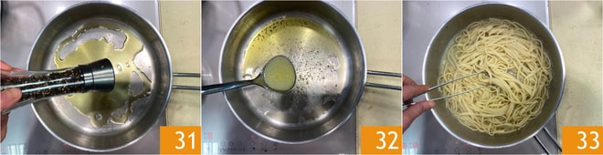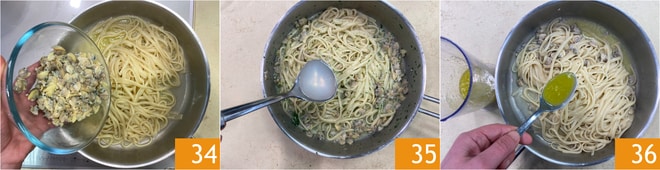 In der Zwischenzeit in einer Pfanne etwas Öl mit gemahlenem schwarzem Pfeffer erhitzen 31, das Dressing mit einer Kelle Lupinenkochflüssigkeit verlängern 32 und gut erhitzen. Nach 5 Minuten die Linguine abgießen und direkt in die Pfanne geben 33. Den Geschmack regulieren, indem man, falls der Geschmack schon intensiv ist, Kochwasser der Pasta oder, falls es etwas fade ist, Lupinenkochflüssigkeit hinzufügt.