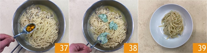 Einen Esslöffel Sardellenextrakt 37 und die kalte Petersilienbutter aus dem Kühlschrank hinzufügen 38. Auch mit einem Tropfen Öl abschmecken und die Pasta gut rühren, um sie cremig zu machen. Die Linguine sofort auf Tellern anrichten 39.