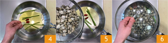 Geben Sie in eine Pfanne etwas Olivenöl, die Stängel der Petersilie, eine Knoblauchzehe in der Schale und die in der Mitte geteilte Chilischote 4. Lassen Sie es ziehen, bis das Öl sehr heiß ist, dann geben Sie die Lupinen hinzu 5 und decken sofort mit einem Deckel ab 6.