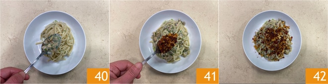Die auf dem Boden der Pfanne verbliebenen Lupinen hinzufügen 40 und mit der Mischung aus knusprigen Paprikaschoten und Brot abschließen 41. Schließlich mit geriebener Zitronenschale garnieren. Ihre Linguine mit Lupinen und knusprigen Paprikaschoten sind servierfertig 42!
