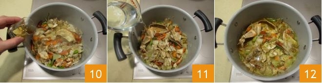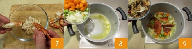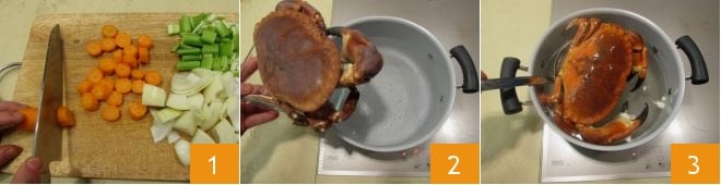 Drehen Sie die Beine einzeln mit einer festen Bewegung in die entgegengesetzte Richtung, um sie abzutrennen und holen Sie das versteckte Fleisch heraus 7. Bewahren Sie die Reste auf, da sie benötigt werden. Lassen Sie in einem Topf die Butter schmelzen und fügen Sie das Öl hinzu 8. Geben Sie das grob geschnittene Gemüse hinzu und lassen Sie es 5 Minuten anbraten. Fügen Sie die Krabbenreste hinzu 9,