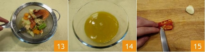 Wenn es fertig ist, filtern Sie alles mit einem feinen Sieb 13 und legen Sie es beiseite 14. Schneiden Sie den Chili der Länge nach auf und entfernen Sie die inneren Samen 15.