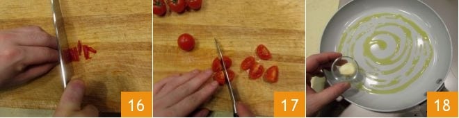 Hacke ihn fein 16, wasche dann die Kirschtomaten und teile sie in 4 Teile 17. Brate eine Knoblauchzehe in einer Antihaftpfanne mit einem Schuss Olivenöl an 18;