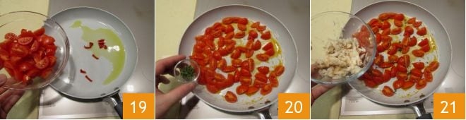 entfernen Sie den Knoblauch und fügen Sie den Chili und die Kirschtomaten hinzu 19, würzen Sie mit Salz und Pfeffer und fügen Sie den Thymian hinzu, lassen Sie es 10 Minuten kochen 20. Geben Sie das Krabbenfleisch in die Pfanne 21