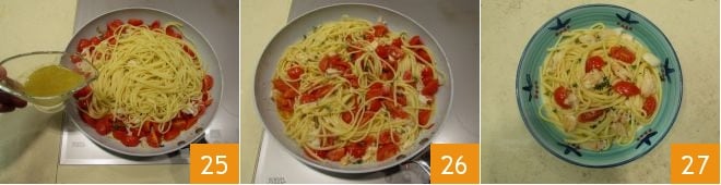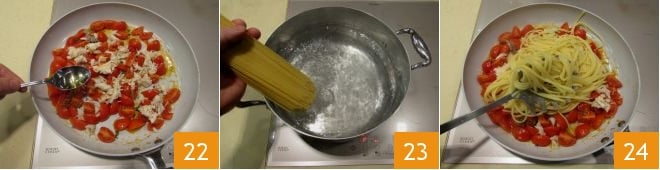zusammen mit der zuvor zubereiteten Brühe 22, rühren Sie mit einem Spatel und schalten Sie aus. Setzen Sie einen Topf mit Wasser auf das Feuer, wenn es kocht, kochen Sie die Linguine 8 Minuten al dente 23. Wenn sie fertig ist, schöpfen Sie die Pasta ab und geben Sie sie direkt in die Pfanne mit der Soße 24;