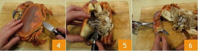 Fahren Sie mit der Reinigung der Krabbe fort: Entfernen Sie mit einem kleinen Messer die Schwanzflosse 4 und trennen Sie den oberen vom unteren Teil. Entfernen Sie den Magenbeutel, die weichen Kiemen, da sie nicht essbar sind 5, und nehmen Sie das zarte, cremige Fleisch heraus. Öffnen Sie die Scheren mit einer Zange 6 und nehmen Sie das Fleisch in großen Stücken heraus.