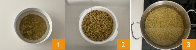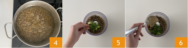 Um das Linsen-Hummus vorzubereiten, prüft, ob die Linsen, die ihr verwendet, eingeweicht werden müssen oder nicht. Falls ja, könnt ihr sie etwa 7-8 Stunden in kaltem Wasser einweichen 1. Nach der Zeit, spült sie sehr gut ab 2 und gebt sie in einen Topf. Bedeckt sie großzügig mit Wasser 3
