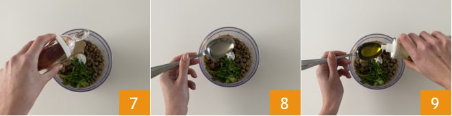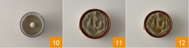 Alles für eine Minute mixen, bis eine homogene Creme entsteht 10. Das Linsen-Hummus anrichten 11 und einen Tropfen Öl und eine Prise Paprika hinzufügen 12.