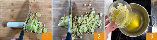 Um die Linsensuppe zuzubereiten, schneiden Sie den weißen Teil des Lauchs fein 1. Schälen Sie die Kartoffeln und schneiden Sie sie in 1 cm große Würfel 2. Erhitzen Sie in einem Topf etwas Öl, geben Sie den Lauch hinein und braten Sie ihn an 3.