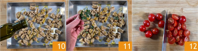 Verteilen Sie die Croutons auf einem Backblech, würzen Sie mit Salz, Pfeffer, Öl 10 und frischem Oregano 11. Rösten Sie das Brot im vorgeheizten Umluftofen bei 200°C für 8 Minuten. Waschen und halbieren Sie die Kirschtomaten 12.