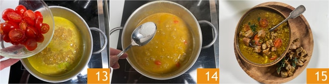 Fügen Sie dann die Kirschtomaten hinzu 13 und kochen Sie weitere zehn Minuten. Prüfen Sie, ob die Suppe die gewünschte Garstufe erreicht hat, würzen Sie mit Salz 14 und Pfeffer, nehmen Sie den Topf vom Herd und lassen Sie die Suppe einige Minuten ruhen. Servieren Sie die Linsensuppe heiß, geben Sie etwas rohes Öl, eine Prise Pfeffer und die Brotcroutons hinzu 15.